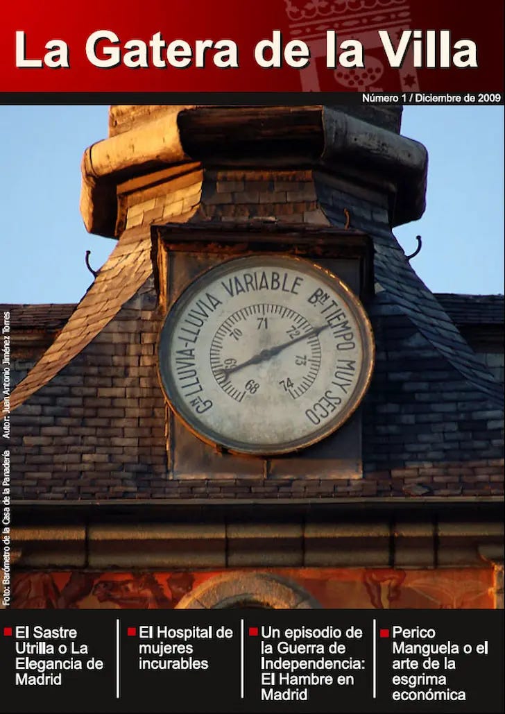 Y a finales de 2009 salió el número 1, con una foto mía en la portada del barómetro que hay en la Casa de la Panadería. Aún tenía pocas páginas, las imágenes eran con poca resolución, etc… hasta que haciendo camino fuimos aprendimos a maquetar mejor con Scribus, que era el programa OpenSource que propuse para maquetar y generar los PDFs y fuimos mejorando las plantillas de la revista. Vinieron colaboraciones de otras personas relacionadas con la madroñosfera, de algún que otro experto y de amigos, aunque siempre hubo un núcleo de La Gatera de la Villa que generaba contenido para la revista.