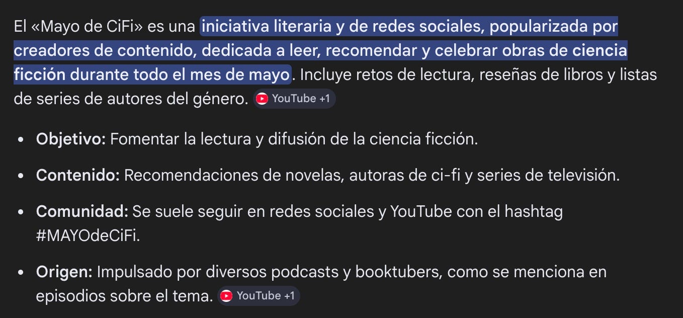Hace años surgió en youtube una iniciativa de leer durante el mes de mayo libros de ciencia ficción que se ha ido extendiendo al resto de las redes sociales. Yo lo descubrí el año pasado, pero en comentarios me dijeron que podía estar relacionado con que el 4 de mayo se celebra el día de Star Wars… y todo es porque en inglés ese día es «may 4th» y que se asemeja fonéticamente al «may force with you», que la fuerza te acompañe o que la fuerza esté contigo que se tradujo en español. Puede ser que el mes de la ciencia ficción sea por eso. Me cuadra.